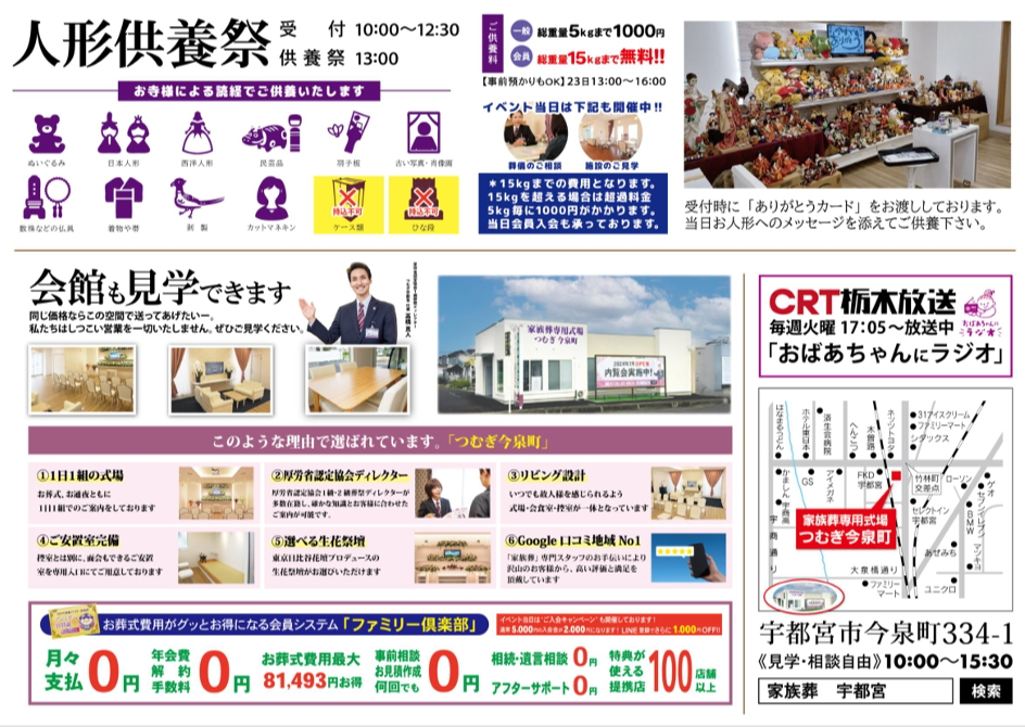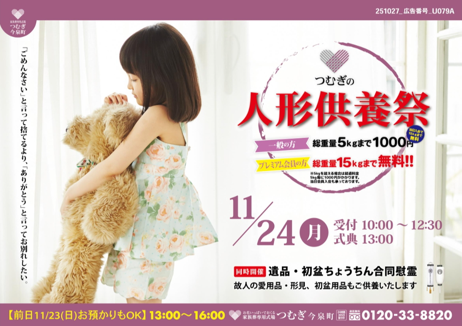 さて、この三連休の最終日、11月24日(月)祝日は、午後1時より【つむぎ今泉町】にて、なすの斎場グループ様主催による人形供養祭を浄光院が執り行います。宇都宮市ご近隣の皆様はもちろん、ご遠方からの皆様も、物見遊山気分で見てみたいという方も、僧侶の読経に癒されてみたいという方も、三連休の予定が急遽キャンセルになってしまったという方も、お人形さんをお持ち頂かなくても大歓迎です。皆様のご来場をお待ちしております。